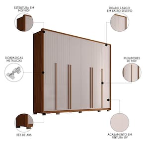 Esse guarda roupa 100% MDF conta com excelente estrutura, o que o torna robusto e resistente, suportando grande capacidade de armazenamento. Além disso, o amplo compartimento interno com diversas prateleiras, seis gavetas e dois cabideiros permitem que você disponha as roupas do casal de forma organizada, facilitando o acesso no dia a dia, ou seja, as horas de se arrumar para sair ficarão bem mais leves e organizadas. Ah, sem contar que não terá mais problemas de roupas espalhadas pelo quarto de casal. Já o charme está no detalhe ripado baixo relevo em quatro, das seis portas, garantindo aquele toque de modernidade e sofisticação. Para completar, os pés evitam o contato direto do roupeiro com o chão, evitando assim, umidade e desgaste da parte inferior. Afinal, é um guarda roupa casal para durar muito tempo.