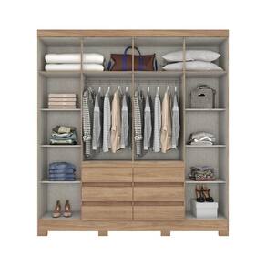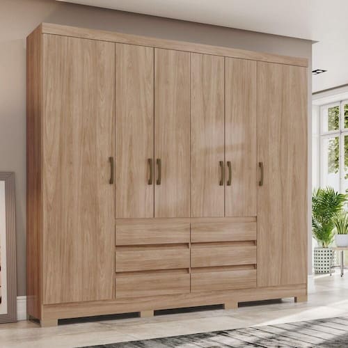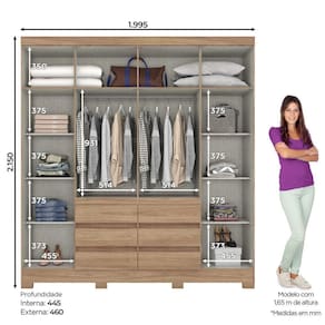 FICHA TECNICA: Acabamento: Na versao Jequitiba Brilho a Pintura e UV e na versao Castanho a Pintura e UV Texturizada Cor Interna: Trama Escala de Brilho: Na versao Castanho e Fosco, na versao Jequitiba Brilho e Brilho Material do Fundo: MDF Possui Espaco para Vestidos Longos: Nao Possui Maleiro: Sim Possui porta Objetos: Nao Possui Cabideiro: Sim Peso Maximo por Cabideiro: O cabideiro suporta ate 8 Kg, a carga deve ser distribuida uniformemente. Qtd. Portas: 6 Und. Tipo Porta: Bater Material da Porta: MDP Material da Dobradica: Metalica Material do Puxador Porta: ABS Qtd. Gavetas: 6 Und. Material da Gaveta: MDP Material da Corredica: Metalica Peso Maximo por Gaveta: Cada gaveta suporta ate 3 Kg, a carga deve ser distribuida uniformemente. Qtd. Prateleiras: 6 Und. Material da Prateleira: MDP Peso Maximo por Prateleira: Cada prateleira suporta ate 8 Kg, a carga deve ser distribuida uniformemente. Possui pes: 8 Und. Material dos Pes: ABS Altura Pes/Rodapes: 5 Cm Pes Regulaveis: Nao Possui Espelho: Nao Produto Suporta ate (Kg): 102 Kg Material Principal: MDP Medidas Montado (A x L x P): 215 x 199,5 x 46 cm Peso Montado: 106 Kg