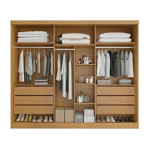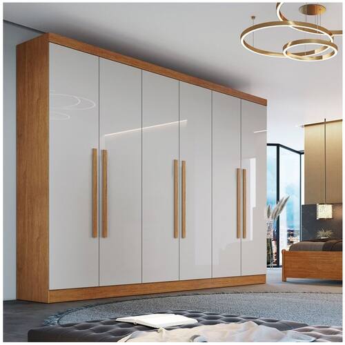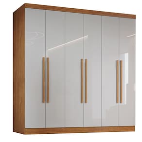 O guarda-roupa possui seis portas, o que permite fácil acesso ao seu interior. Cada porta possui um puxador discreto e elegante, contribuindo para o visual sofisticado do móvel. As portas são espaçosas e fornecem amplo espaço para pendurar roupas, como vestidos, camisas e casacos.