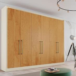 Guarda roupa casal com 6 portas de bater, MDF, 6 gavetas com corrediças telescópicas, cabideiros em alumínio, interno ELE e ELA, puxadores aluminio na cor bronze. Um modelo funcional para deixar o seu ambiente completo. Espaço para roupas longas e prateleiras funcionais e maleiro.Um moldura interna reversível com sistema flex color.