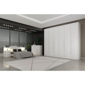 Particularidades do guarda-roupa: Características: - 100% MDF; - Colunado em 25mm; - Puxadores com acabamento amadeirado; - 6 Gavetas internas com puxadores; - Corrediças telescópicas; - Dobradiça de pressão de 35mm; - Fundo inteiriço; - Cabideiros em alumínio;