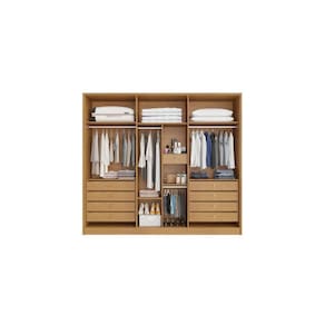 Este guarda-roupa casal é muito funcional. Excelente espaço interno, fabricado com chapa de MDF de 15mm, possui 8 gavetas internas grandes com corrediças telescópicas, puxadores nas gavetas, ainda podemos contar com 1 gaveta menor com chave. Imagina! Veja o espaço interno deste produto. 3 cabideiros em alumínio, 8 prateleiras internas. costas inteiras, 6 portas com dobradiças reforçadas e puxadores em madeira. Espelho interno e porta-objetos fixados na porta.