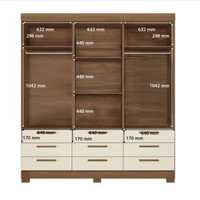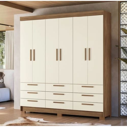 06 PortasPuxadores em MDF revestidosPés em PVC09 Gavetas externas com corrediças telescópicas02 cabideiros/calceiros em alumínio04 Amplas prateleirasAmplo maleiroAcabamento das cores Jatobá/Areia: 165343 MedidasAltura - 2140 mmLargura - 1944 mmProfundidade - 460 mmPeso - 110 Kg