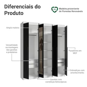 Possui uma pintura de alta resistência, que garante durabilidade e um acabamento impecável por muito mais tempo. A estrutura é na coloração Branca, as portas e os puxadores são na coloração preta, criando um visual sofisticado que se adapta a qualquer estilo de decoração. Os puxadores de 80 cm, fabricados em MDF, são um dos grandes diferenciais, trazendo um design alongado e moderno.