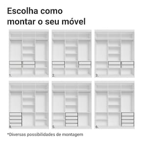 O Guarda-Roupa Venus oferece versatilidade para organizar seu espaço da melhor forma. Com dobradiças com amortecimento, as portas fecham suavemente. As gavetas com corrediças telescópicas permitem abertura total, enquanto o amplo maleiro é perfeito para itens maiores. Além disso, você pode ajustar as gavetas e prateleiras para personalizar o interior conforme suas necessidades. As portas do meio possuem espelho, agregando ainda mais funcionalidade e sofisticação ao móvel.