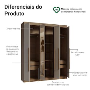 As portas fecham de forma suave e silenciosa, por possuir dobradiças com amortecimento. As gavetas permitem uma abertura completa e o amplo maleiro é perfeito para armazenar itens maiores. O interior do guarda-roupa pode ser personalizado, com a possibilidade de ajustar as gavetas e prateleiras conforme suas necessidades. Além disso, as portas do meio possuem espelho, agregando ainda mais funcionalidade ao móvel.