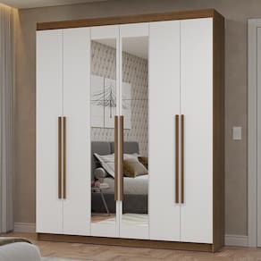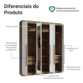 Com dobradiças com amortecimento, suas portas fecham de forma suave e silenciosa, garantindo durabilidade e conforto. As gavetas permitem abertura completa, proporcionando fácil acesso a tudo o que você precisa. O amplo maleiro é ideal para armazenar itens maiores, enquanto a possibilidade de ajustar as gavetas e prateleiras oferece total liberdade para personalizar o interior do guarda-roupa. Além disso, as portas do meio possuem espelho, agregando ainda mais funcionalidade ao móvel.