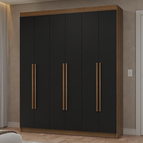 Possui uma pintura de alta resistência, que garante durabilidade e um acabamento impecável por muito mais tempo. A estrutura e os puxadores é em tom amadeirado Rustic e das portas em Preto, criando um visual sofisticado que se adapta a qualquer estilo de decoração. Os puxadores de 80 cm, fabricados em MDF, são um dos grandes diferenciais, trazendo um design alongado e moderno.