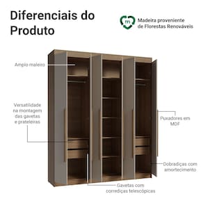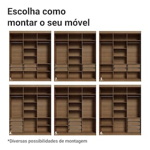 Com dobradiças com amortecimento, suas portas fecham de forma suave e silenciosa, garantindo durabilidade e conforto. As gavetas permitem abertura completa, proporcionando fácil acesso a tudo o que você precisa. O amplo maleiro é ideal para armazenar itens maiores, enquanto a possibilidade de ajustar as gavetas e prateleiras oferece total liberdade para personalizar o interior do guarda-roupa.