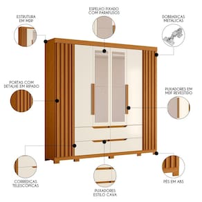 Esse guarda roupa casal grande foi projetado com as portas laterais com detalhe ripado, que adicionam um toque de charme e estilo ao ambiente. Já as 4 gavetas espaçosas possuem puxadores estilo cava, proporcionando um visual moderno e sofisticado. Além disso, as corrediças telescópicas garantem um deslizamento suave e sem ruídos. Na parte interna, com os cabideiros em alumínio, você terá amplo espaço para pendurar suas roupas sem se preocupar com amassados, ao passo que as diversas prateleiras são uma ótima opção para roupas que podem dobrar ou até mesmo para dispor calçados, bolsas e até itens de maquiagem. Outro detalhe são os pés inclusos, que oferecem estabilidade e durabilidade ao móvel, além de facilitar a limpeza do ambiente. Para completar, o jogo de espelho é perfeito para você conferir seu visual antes de sair, além de contribuir para a sensação de profundidade no ambiente.