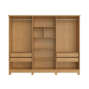 O Guarda Roupa Nina seis portas é uma escolha excelente para quem busca qualidade e funcionalidade. Fabricado com 100 de MDF de alta qualidade e estrutura reforçada, oferece um amplo espaço interno dividido no sistema ELE e ELA, ideal para organizar tudo o que você precisa. Com 6 portas e 4 gavetas, todas com corrediças telescópicas para maior praticidade no uso diário. Possui um nicho organizador com 3 prateleiras centrais bem distribuídas, perfeito para armazenar itens menores. Inclui espaço dedicado para roupas longas, cabideiros em alumínio e puxadores em madeira envelopada, garantindo um toque elegante ao ambiente.