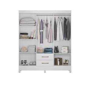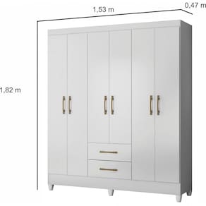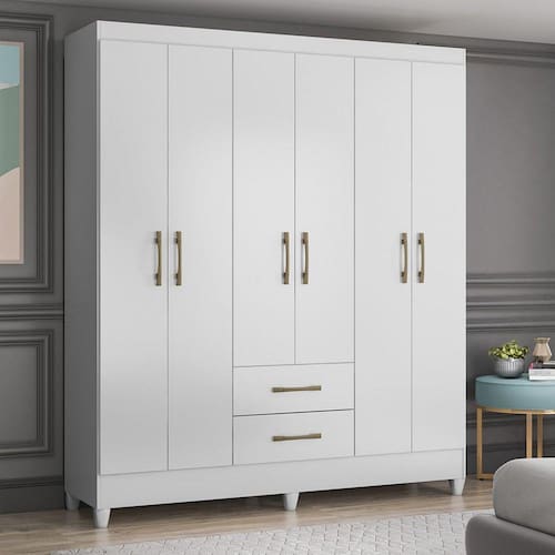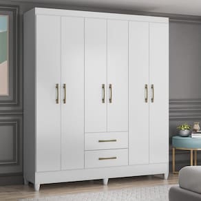 O guarda-roupa Panamá é feito em MDP, possui 6 portas e 2 gavetas com corrediças metálicas. Tem cabideiro e um amplo espaço interno com espaço bem dividido entre as prateleiras, conta também com puxadores na Cr bronze e bastão em madeira reflorestado revestido. Acabamento da Prateleira: Impressão Escala de Brilho da Prateleira: Semi-Brilho Possui Cabideiros: 02 Acabamento da Gaveta: Impressão Escala de Brilho da Gaveta: Brilhante Material do Puxador da Gaveta: Plástico Possui Organizador de Gaveta: Não Acabamento da Porta: Impressão Escala de Brilho da Porta: Brilhante Material do Puxador da Porta: Plástico Acabamento dos Pés: Poliéster : 1,82 cm dos Pés: 7 cm Ambiente Principal: Quarto calculo: unidade Complexidade da Montagem: Média: pode ser montado por mais de uma pessoa e/ou necessite de maior conhecimento para montagem Cr: Branco Cr do Produto: Branco Cr Interna: Branco Escala de Brilho: Brilhante Estilo: Moderno Gaveta com Chave: Não Guarda-Roupa Suporta Até (kg): 78 kg Itens Inclusos: 1 Guarda Roupa, Manual de Montagem e Kit Ferragens : 1,53 cm Linha ou Coleção: Panamá Manual de Montagem e Instalação: https://cdn2.madeiramadeira.com.br/atributo/moval/740977-640-20-9530-guarda-roupa-panam.pdf Material da Gaveta: MDP Material da Porta: MDP Material da Prateleira: MDP Material dos Pés: PVC Material Principal: MDP Montagem Flex: Não Necessita Montagem: Sim Origem do Produto: Nacional Peso: 75,84 kg Peso Máximo por Gaveta: 6 kg Peso Máximo por Prateleira: 6 kg Possui Calceiros: Não Possui Espaço para Vestidos Longos: Não Possui Espelho: Não Possui Espelho Interno: Não Possui Ganchos: Não Possui Gavetas: 02 Possui iluminação: Não Possui Painel de TV: Não Possui Pés: 06 Possui Portas: 06 Possui Prateleiras: 04 Possui Sapateira: Sim : 0,47 cm Recomendações de Uso, Manutenção e Limpeza: Limpeza deve ser realizada com pano macio e seco - não utilizar produtos abrasivos Sapatas Niveladoras: Não Sistema de Montagem: Parafuso, Cavilha e Girofix Tamanho: Tipo de Corrediça da Gaveta: Metálica Simples Tipo de Dobradiça/Corrediça da Porta: Metálica Tipo de Gaveta: Externa Tipo de Guarda-Roupa: Casal Tipo de Porta: Bater Tipo de Puxador da Gaveta: Externo Tipo de Puxador da Porta: Externo