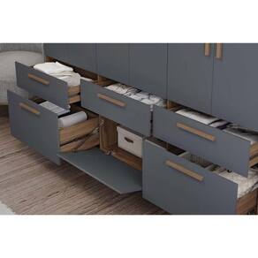 CARACTERÍSTICAS DE MÓVEIS Tipo de Estrutura do Móvel - 100% MDF Tipo de Pintura - UV Tipo de Acabamento da Pintura - Fosca Tipo de puxador - MDF Quantidade de Prateleiras - 4 Prateleiras Quantidade de Gavetas - 5 Diferenciais da Gaveta - c/ Corrediças Telescópicas Quantidade de Portas - 7 Portas de Abrir Garantia - 3 meses