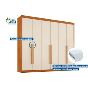 Tipo de Cabideiro - Aéreo Material dos Cabideiros - Cabideira Metálico Tipo de Porta do Guarda-Roupa - Portas de Bater Material das Portas - Portas em MDF Tipo de Dobradiças - Dobradiças Metálicas Quantidade de Portas - 6 Portas de Abrir Material das Gavetas - Gavetas em MDF Tipo de Corrediça - c/ Corrediças Telescópicas Quantidade de Gavetas - 6 Gavetas Material das Prateleiras - Prateleiras em MDF Quantidade de Prateleiras - 8 Quantidade de Nichos - 2 Nichos