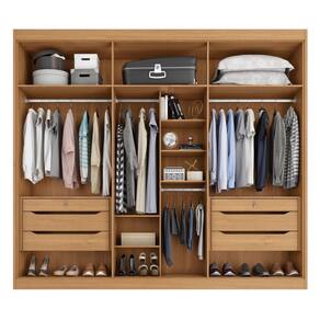 Características: 6 Gavetas possuem corrediças telescópicas 6 Portas 5 Prateleiras em MDF 15mm 1 Calceirometálicos 3 Cabideiros metálicos Dobradiças metálicas de 35mm com pistão Diferencial a primeira de cada lado vem com colmeia e chave Estrutura 100 em MDF Puxadores de MDF Molduras laterais de 25mm
