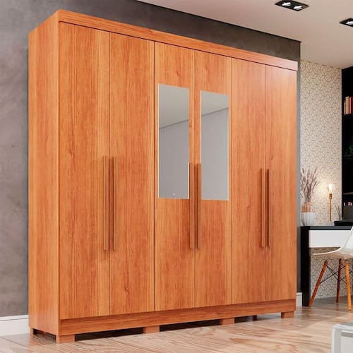 Guarda-roupa Casal 6 Portas Espelho 2 Gavetas Recife Sallêto Cinamomo Este lindo Guarda Roupa com Pe 6 Portas com Espelho 2 Gavetas e um produto de excelente qualidade, diferenciado pela sua resistencia, durabilidade, funcionalidade e beleza, ele e a melhor opcao para deixar seu dormitorio muito mais arrumado e convidativo. Com corredicas telescopicas que permitem uma abertura total das gavetas, parte interna espacosa, divisoes internas que oferecem praticidade e organizacao, puxadores de madeira que garante maior durabilidade, suporte embaixo das gavetas para dar uma sustentacao reforcada e cabideiro em aluminio. Se encaixa facilmente em varios estilos de decoracao com cores modernas. Aproveite, voce merece! Caracteristicas do Produto: Marca: Salleto Moveis Modelo: Recife Material Principal Moveis: MDP Material Da Porta: MDP Quantidade de gavetas: 02 Escala da Brilho: Semi-Fosco Acabamento da Porta: Pintura Escala de Brilho da Porta: Semi-Fosco Tipo de Dobradica/Corredica da Porta: Metalica Acabamento da Prateleira: Pintura Escala de Brilho da Prateleira: Semi-Fosco Material da Prateleira: MDP Possui Prateleiras: 06 Tipo de Porta: Bater Possui Portas: 6 Possui Espelho na porta: Sim Tipo de puxador: Externo Material puxador: MDF Possui Pes: 08 Peso Maximo por Prateleira: 3Kg Estilo: Moderno Necessita Montagem: Sim Sapatas Niveladoras: Nao Pes regulaveis: Nao Porta com Chave: Nao Complexidade da Montagem; Alta: deve ser montado por um montador especializado Sistema de Montagem; Parafusos, dobradicas e Cavilhas. Recomendacoes de Uso, Manutencao e Limpeza; Limpeza com pano macio e levemente umedecido. Nao utilizar solventes a base e de inflamaveis. Nao utilizar produtos abrasivos.