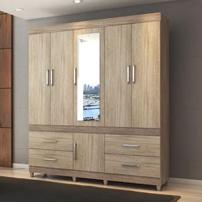 Roupeiro que se destaca pela sua configuração interna e externa oferecendo prateleiras na divisão central e compartimento inferior exclusivo para sapatos. Porta central com espelho que proporciona um visual moderno aliada a utilidade para o dia a dia. Gavetas com dimensões avantajadas que acomodam maior quantidade de roupas. O produto também vem com pés em PVC para a facilitar a limpeza do piso ao redor do produto.