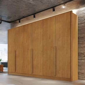 Particularidades do guarda-roupa: Características: -Fabricado em MDF de 15mm -6 portas de puxar com dobradiças reforçadas -Puxadores das portas em madeira -8 gavetas internas grandes com corrediças telescópicas -1 gaveta interna pequena com chave -Espelho interno -Fundo de gaveta em HDF -Interior com divisão exclusiva -Amplo espaço interno, para malas e roupas de cama -3 Cabideiros de alumínio -Costas inteiras -Parte interna na cor do produto