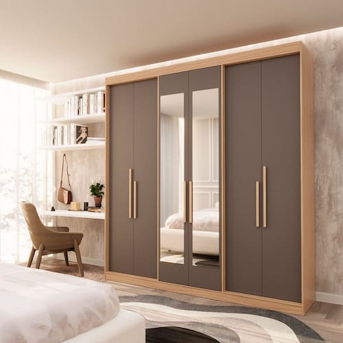 O Guarda Roupa 6 Portas Lugano MDF é inovador e moderno. Com 3 opções de montagens interna, ele agrega beleza, sofisticação e um amplo espaço interno. O modelo conta com 2 gavetas, 10 prateleiras e 2 cabideiros metálicos a depender do tipo de montagem escolhida. Suas corrediças são metálicas e as dobradiças caneco. Se você busca inovação para o seu ambiente, o guarda roupa Lugano é a escolha certa! Acabamento da Prateleira: Pintura UV Escala de Brilho da Prateleira: Semi-Brilho Possui Cabideiros: 02 Acabamento da Gaveta: Pintura UV Escala de Brilho da Gaveta: Semi-Brilho Possui Organizador de Gaveta: Não Acabamento da Porta: Pintura UV Escala de Brilho da Porta: Semi-Brilho Material do Puxador da Porta: MDF Altura do Espelho: 160 cm Ambiente Principal: Quarto codigo_ean: 7900288050496 Complexidade da Montagem: Alta: deve ser montado por um montador especializado Cor: Cedro/Cinza Cor da Porta: Branco Cor do Produto: Cedro/Cinza Cor do Puxador: Marrom Cor Interna: Linho Escala de Brilho: Semi-Brilho Espessura da Estrutura (mm): 12 mm Espessura das Portas (mm): 15 mm Espessura das Prateleiras (mm): 15 mm Espessura do Espelho: 3 mm Espessura do Fundo (mm): 12 mm Espessura do Fundo das Gavetas (mm): 12 mm Fita Integrada: Sim Formato do Espelho: Retangular Gaveta com Chave: Não Guarda-Roupa Suporta Até (kg): 70 kg Itens Inclusos: 1 Guarda Roupa + 1 Manual de Montagem Largura do Espelho: 26,5 cm Linha ou Coleção: Lugano Manual de Montagem e Instalação: https://product-hub-prd.madeiramadeira.com.br/975353/documents/f0c34e47-76b8-486e-bffc-32ce7f4f57fc62522661489017303066627635.pdf Marca: Edez Material da Gaveta: MDF Material da Porta: MDF Material da Prateleira: MDF Material Principal: MDF modular: Não Montagem Flex: Sim Necessita Montagem: Sim Nicho com Cabideiro: Sim Origem do Produto: Nacional Peso: 149,6 kg Peso Máximo por Gaveta: 5 kg Peso Máximo por Prateleira: 5 kg Porta Janelada: Não Possui Calceiros: Não Possui Capelinha: Não Possui Espaço para Vestidos Longos: Não Possui Espelho: Sim Possui Espelho Interno: Não Possui Ganchos: Não Possui iluminação: Não Possui Nichos: Não Possui Painel de TV: Não Possui Penteadeira: Não Possui Pés: Não Possui Portas: Sim Possui Prateleiras: Sim Possui Sapateira: Não Produto Montado: Sim Quantidade de Cabideiros: 02 Cabideiros Quantidade de Espelho: 02 Espelhos com Tamanhos Iguais Quantidade de Gavetas: 02 Gavetas Quantidade de Portas com Espelhos: 2 Portas com Espelho Quantidade de Prateleiras: 10 Prateleiras Recomendações de Uso, Manutenção e Limpeza: Recomenda-se a utilização de pano seco. Sistema de Montagem: Parafuso e Minifix Suporta Até (kg): 70 kg Tipo de Corrediça da Gaveta: Metálica Simples Tipo de Dobradiça/Corrediça da Porta: Metálica Tipo de Fixação do Espelho: Fita Dupla Face Tipo de Gaveta: Interna Tipo de Guarda-Roupa: Casal Tipo de Puxador da Gaveta: Não Possui Tipo de Puxador da Porta: Externo