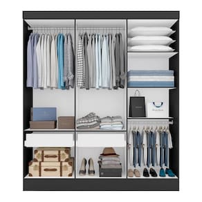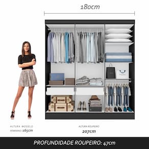 O Guarda Roupa Casal 6 Portas Mariah exibe um design moderno e funcional, uma combinação perfeita de funcionalidade e estilo para organizar e embelezar o espaço do seu quarto.Detalhes Técnicos- Montado: A: 207cm | L: 180cm | P: 47cm- 8 Divisões internas- 6 Portas de bater- 6 Puxadores- 4 Prateleiras- 2 Gavetas- 2 Cabideiros- Gavetas e Prateleiras suportam até 5kgMateriais- MDP- Dobradiças e Corrediças metálicas- Puxadores em madeira- Cabideiros em alumínio- Revestimento: FF Fosco- Tonalidade: PretoConteúdo da Embalagem- 01 Guarda Roupa- Manual de Montagem- Acessórios para MontagemObservações Importantes- As imagens ambientadas são meramente ilustrativas e podem apresentar itens que não incorporam o produto;- Todos os nossos produtos são novos, acompanham documento fiscal e possuem garantia de 3 meses, essa garantia cobre somente defeitos de fabricação;- A entrega só será efetuada no endereço do CEP, caso o endereço seja diferente do CEP informado no pedido, a entrega terá cobrança adicional e o comprador arcará com as despesas;- Não realizamos entregas para zonas rurais, via caminhos fluviais e distritos, por isso não aceitamos CEP GERAL da região;- Não é possível realizar o agendamento de entrega do produto, é necessário que acompanhe o rastreio de seu pedido para saber a previsão de entrega;- As entregas somente serão realizadas para um responsável maior de idade (+18);- Enviamos para diversos estados, sendo assim nossas entregas são realizadas por transportadoras parceiras de nossa empresa. Confira as dimensões antes da compra e certifique-se de que o produto passará por elevadores, portas e corredores já que nossa entrega não inclui a subida de lances de escada, transporte por elevador e o lançamento de produtos, em caso de condomínios residenciais a entrega é feita somente até a portaria. Todas as entregas são realizadas em dias e horários comerciais;- Ao receber os seus produtos observe se a embalagem se encontra em perfeitas condições. Se você adquiriu algum móvel, confira atentamente a quantidade de volumes e o aspecto físico das embalagens. Confira também se a cor do móvel está de acordo com o seu pedido;- O prazo de cancelamento por arrependimento é de até 7 dias corridos a contar da data de recebimento;- Os produtos e assistências são enviados DESMONTADOS, MONTAGENS E DESMONTAGENS recomendamos sempre a contratação de um montador profissional e é válido lembrar que o custo desses serviços é por conta do comprador;- Objetos decorativos que aparecem na foto não acompanham o produto;- Evitar a exposição direta à luz solar e à umidade;- Para limpeza, limpar com pano macio e seco, não utilizar qualquer outro tipo de produtos químicos;- As cores do produto podem variar de acordo com o monitor, a iluminação do ambiente ou sua percepção visual.