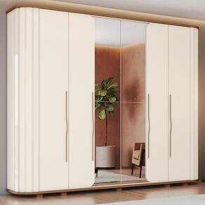 O Guarda-Roupa Casal 6 Portas Premium une design moderno e praticidade para o dia a dia. Produzido em MDP com pintura UV, possui portas com acabamento usinado, espelho integrado, chapéu curvo e apliques ripados nas laterais, garantindo um visual elegante. Conta com puxadores em alumínio, dobradiças com amortecimento e excelente organização interna, com cabideiro em alumínio, prateleiras e seis gavetas com corrediças telescópicas. Os pés em ABS oferecem estabilidade, enquanto o amplo espaço interno torna o móvel ideal para manter o quarto funcional e bem organizado.