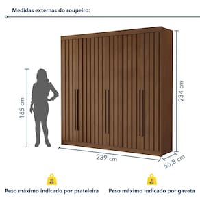 Está procurando um guarda roupa 100%MDF, espaçoso e que ainda levanta o nível da decoração do seu quarto? Então, nosso guarda roupa ripado é a sua escolha certa! Ele une resistência com acabamento top. Com 6 gavetas com corrediças telescópicas para você guardar tudo com praticidade, cabideiros em alumínio que aguentam o tranco, puxadores em madeira que dão aquele charme natural e fundo inteiriço que deixa tudo mais firme. Ah, e as dobradiças Slow Motion não deixam nenhuma porta bater, é conforto até na hora de fechar!
