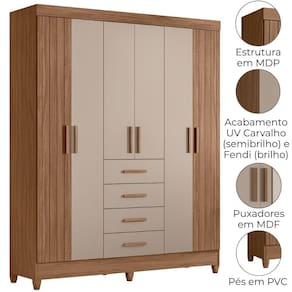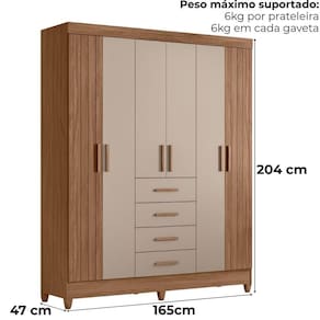 Projetado para atender às necessidades do dia a dia, o Guarda-Roupa Casal Aruba oferece espaço e modernidade. Estrutura em MDP (15/ 12 mm) e acabamento em pintura UV. Composto por portas com dobradiças metálicas (portas laterais em MDF com detalhe frisado), cabideiro interno (alumínio), gavetas com corrediças metálicas e prateleiras. Produto com dupla opção de montagem: pés em PVC ou sapatas plásticas (2 mm) conforme preferência do cliente. Este produto será entregue em 03 volumes.