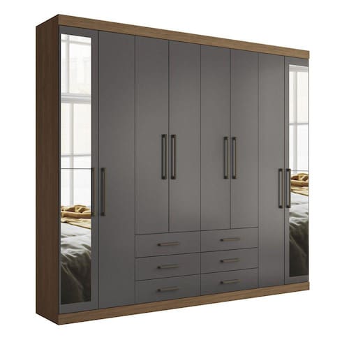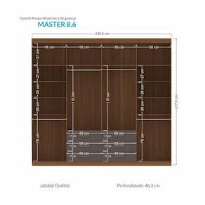 Guarda Roupa Casal 8 Portas 6 Gavetas c/ espelho Havana Master Santos Andirá Um guarda-roupa completo! Com muito espaço para todas as suas roupas. Com 06 amplas gavetas que além de espaçosas, deslizam sobre corrediças metálicas, facilitando o abrir e fechar de todos os dias. Possui espaço interno privilegiado com 04 cabideiros/calceiros em alumínio, para pendurar as roupas com organização e qualidade, puxadores em ABS, deixando o produto muito moderno, e 10 amplas prateleiras para guardar as roupas que precisam ser dobradas. Características:08 Portas com dobradiças metálicas 10 Prateleiras 04 cabideiros em alumínio 06 Gavetas com corrediças metálicas Amplo maleiro Puxadores em ABS Dimensões:Altura: 217,6cmLargura: 238,8 cmProfundidade: 46,3 cmPeso: 145,00Kg Medidas da gaveta: Altura: 10,1 cm Largura: 53,3 cm Profundidade: 35 cm Manutenção: Não limpar com álcool ou qualquer outro produto químico, utilize somente pano seco ou levemente umedecido.Garantia de Fábrica: 03 Meses (90 dias)