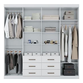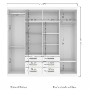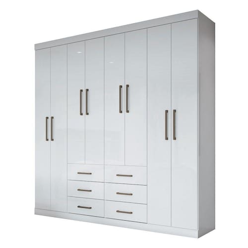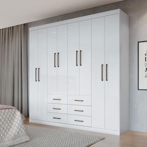Ah, não há nada melhor do que decorar a casa do nosso jeitinho. Não é mesmo? Só que o melhor disso, é se além da decoração ser agradável, a funcionalidade dos itens escolhidos seja igualmente boa. Para isso, a Santos Andirá desenvolveu o Guarda Roupa Liverpool Branco, confira!Ele é um guarda roupa 8 portas, ou seja, excelente para quem ocupa muito espaço. As portas possuem dobradiças metálicas, mas ele também conta com 6 gavetas de amplo espaço interno, 3 cabideiros e várias prateleiras formando nichos com espaço suficiente para ajudar a organizar suas roupas. Ah, e todo fabricado em MDP/MDF com acabamento em verniz fosco para maior durabilidade e resistência!Resumindo: um item imperdível para quem gosta de organização e estilo!!Não perca tempo, adicione agora mesmo esse guarda roupa casal ao seu carrinho de compras!!Dimensões do ProdutoLargura: 212 cm.Altura: 210 cm.Profundidade: 46,3 cm.Peso: 130 Kg.Características do ProdutoMaterial da Estrutura: MDP.Peso Suportado: Gaveta: 3 Kg / Base: 5 Kg / Prateleiras Menores: 3 Kg / Prateleiras Maiores: 5 Kg / Prateleira Dupla: 8 Kg.Acabamento: Verniz UVEscala de Brilho: Brilhante.Quantidade de Portas: 8 Portas.Possui Espelho: Não.Quantidade de Gavetas: 6 Gavetas.Tipo de Corrediças: Metálicas.Tipo de Puxador: ABS.Possui Cabideiro: Sim.Quantidade de Cabideiros: 3 Cabideiros.Possui Prateleiras: Sim.Quantidade de Prateleiras: 9 Prateleiras.Possui Pés: Não.Diferenciais:- Design Moderno.- Puxador na cor metálica.- Amplo maleiro.Sistema de Montagem: Cavilhas / Parafusos / Girofix.Manual de Montagem: Sim.Complexidade da Montagem: Alta.Volumes: 3 Volumes.Garantia do Fabricante: 90 dias contra defeito de fabricação.Montagem: Recomendamos que seja feita por um profissional.Recomendação de Limpeza: Utilize pano levemente úmido.Observações importantes:- Produto para uso residencial em ambiente interno, não devendo ficar exposto diretamente ao sol, calor e umidades excessivas.- Pode haver alguma diferença de tonalidade entre a imagem e o produto real, por conta do tratamento de imagens e a calibração de cores do seu monitor.- As imagens são meramente ilustrativas, não acompanham objetos de decoração e eletrônicos.- Confira o estado da embalagem, não devendo assinar o comprovante em caso de danos.- Não asseguramos, no ato da entrega, por subir escadas/elevadores, pelo transporte por guincho em apartamentos ou montagem, desmontagem e instalações. Eventuais despesas são por conta do comprador.- Confira as dimensões do produto e certifique-se de que passará normalmente por supostos elevadores, portas, escadas e/ou corredores de sua residência.
