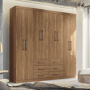 Um guarda-roupa, com muito estilo e funcionalidade! Características:Ele possui puxadores em ABS Contém um ótimo local para armazenar sapatos. Ah! E possui 6 prateleiras para guardar além de roupas, cobertores, toalhas, travesseiros etc. 8 portas. Tudo é claro com muito espaço e organização. Conta também com amplas 6 gavetas internas com corrediças metálicas, que deslizam suavemente. E temos opcionais de pés em Abs e espelhos. Possui 3 cabideiros/calceiros em alumínio, para acentuar ainda mais a praticidade e organização que esse guarda-roupa oferece. Dimensões:Altura: 210 cm Largura: 212 cm Profundidade: 46,3 cm Peso: 133 Kg Observação:Produto para uso residencial em ambiente interno, não devendo ficar exposto diretamente ao sol, calor e umidade excessiva. Pode haver alguma diferença de tonalidade entre a imagem e o produto real, por conta do tratamento de imagens e a calibração de cores do seu monitor. As imagens são meramente ilustrativas, não acompanham objetos de decoração e eletrônicos.A empresa Móvel Decore não se responsabiliza por montagens/desmontagens ou instalação dos produtos adquiridos neste site, como também ficando sob responsabilidade do cliente/comprador eventuais despesas no ato da entrega, por subir escadas/elevadores ou pelo transporte por guincho em apartamentos. Por conta disso, sempre confira as dimensões do produto e certifique-se que as medidas sejam suficientes para entrada em elevadores, portas, escadas e/ou corredores de sua residência.Ao receber a mercadoria, o cliente deve verificar as condições da embalagem, caso haja alguma avaria não assine o comprovante de recebimento.Manutenção: Não limpar com álcool ou qualquer outro produto químico, utilize somente pano seco ou levemente umedecido.Garantia de Fábrica: 03 Meses (90 dias)