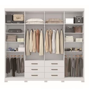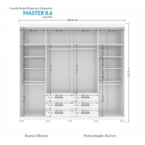 Um guarda-roupa de casal completo é esse roupeiro Master 8 portas da Santos Andirá! Com muito espaço para todas as suas roupas. Com 06 amplas gavetas, que além de espaçosas, deslizam sobre corrediças metálicas, facilitando o abrir e fechar de todos os dias. Possui espaço interno privilegiado com 04 cabideiros/calceiros em alumínio, para pendurar as roupas com organização e qualidade. Puxadores em ABS, deixando o móvel com design muito moderno. 10 amplas prateleiras para guardar as roupas que precisam ser dobradas e decoração. O acabamento na cor branca é com verniz brilhante, tudo dentro dos padrões de preservação do meio ambiente. Possui pés em PVC, que permitem elevar o móvel do chão, facilitando a limpeza embaixo dele. O seu quarto de casal ficará muito mais bonito e prático. Acabamento da Prateleira: Pintura Escala de Brilho da Prateleira: Semi-Brilho Possui Cabideiros: 02 Acabamento da Gaveta: Pintura Escala de Brilho da Gaveta: Semi-Brilho Material do Puxador da Gaveta: ABS Possui Organizador de Gaveta: Não Acabamento da Porta: Pintura Escala de Brilho da Porta: Semi-Brilho Material do Puxador da Porta: ABS Acabamento dos Pés: Pintura Altura dos Pés: 5 cm Ambiente Principal: Quarto Complexidade da Montagem: Alta: deve ser montado por um montador especializado Cor: Branco Cor do Produto: Branco Cor Flex: não Cor Interna: Branco Escala de Brilho: Semi-Brilho Gaveta com Chave: Não Informações Complementares: ROUPEIRO COM PÉS Itens Inclusos: 1 Guarda Roupa com pés e Manual de Montagem Linha ou Coleção: Master Manual de Especificação Técnica: https://cdn2.madeiramadeira.com.br/atributo/santos-andira/508697-152422-20190418-155816.pdf Manual de Montagem e Instalação: https://cdn2.madeiramadeira.com.br/atributo/santos-andira/508696-949134-01-g-r-havana-master-8-6-1.pdf Material da Gaveta: MDP Material da Porta: MDP Material da Prateleira: MDP Material dos Pés: Plástico Material Principal: MDP Montagem Flex: não Necessita Montagem: Sim Origem do Produto: Nacional Peso: 141 kg Peso Máximo por Gaveta: 3 kg Peso Máximo por Prateleira: 3 kg Possui Calceiros: 02 Possui Espaço para Vestidos Longos: Não Possui Espelho: Não Possui Espelho Interno: Não Possui Ganchos: Não Possui iluminação: Não Possui Painel de TV: Não Possui Pés: 10 Possui Portas: 08 Possui Prateleiras: 10 Possui Sapateira: Não Recomendações de Uso, Manutenção e Limpeza: Pano levemente úmido e flanela. Sapatas Niveladoras: Não Sistema de Montagem: Parafusos, Cavilhas, Corrediças e Buchas Tamanho: Tipo de Corrediça da Gaveta: Metálica Simples Tipo de Dobradiça/Corrediça da Porta: Alumínio Tipo de Gaveta: Externa Tipo de Guarda-Roupa: Casal Tipo de Puxador da Gaveta: Externo Tipo de Puxador da Porta: Externo