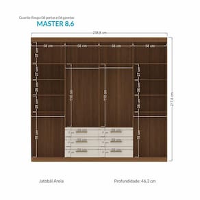 O seu quarto de casal ficará muito mais bonito e prático com esse modelo de roupeiro incrível! Acabamento da Prateleira: Pintura Escala de Brilho da Prateleira: Semi-Fosco Possui Cabideiros: 02 Acabamento da Gaveta: Pintura Escala de Brilho da Gaveta: Semi-Brilho Material do Puxador da Gaveta: ABS Possui Organizador de Gaveta: Não Acabamento da Porta: Pintura Escala de Brilho da Porta: Semi-Brilho Material do Puxador da Porta: ABS Ambiente Principal: Quarto codigo_ean: 7909903490334 Complexidade da Montagem: Alta: deve ser montado por um montador especializado Cor: Jatobá/Areia Cor do Produto: Jatobá/Areia Cor Flex: Não Cor Interna: Jatobá Escala de Brilho: Semi-Fosco Gaveta com Chave: Não Informações Complementares: Para garantir a qualidade do produto dentro da embalagem, as caixas são revestidas por um plástico termoencolhível e todas as peças externas são separadas por isomanta, tudo para preservar e evitar o atrito entre as peças dentro da embalagem. Você contará Itens Inclusos: 1 Guarda Roupa, Kit Ferragens e Manual de Montagem Linha ou Coleção: Master Manual de Especificação Técnica: https://product-hub-prd.madeiramadeira.com.br/879818/documents/0d7e1527-43dc-4b1e-86d2-67ebd835696f1664091152443.pdf Manual de Montagem e Instalação: https://product-hub-prd.madeiramadeira.com.br/879818/documents/9abc5649-bf59-446b-8e74-a78f74ab8c0e166409294923206grmaster86.pdf Material da Gaveta: MDP Material da Porta: MDP Material da Prateleira: MDP Material Principal: MDP modular: Não Montagem Flex: Não Necessita Montagem: Sim Origem do Produto: Nacional Peso: 140,5 kg Peso Máximo por Gaveta: 3 kg Peso Máximo por Prateleira: 3 kg Possui Calceiros: 02 Possui Espaço para Vestidos Longos: Não Possui Espelho: Não Possui Espelho Interno: Não Possui Ganchos: Não Possui iluminação: Não Possui Nichos: Não Possui Painel de TV: Não Possui Pés: Não Possui Portas: Sim Possui Prateleiras: Sim Possui Sapateira: Não Produto Montado: Sim Quantidade de Gavetas: 06 Gavetas Quantidade de Prateleiras: 10 Prateleiras Recomendações de Uso, Manutenção e Limpeza: Pano levemente úmido e flanela. Sistema de Montagem: Parafusos, Cavilhas, Corrediças e Buchas Tipo de Corrediça da Gaveta: Metálica Telescópica Tipo de Dobradiça/Corrediça da Porta: Metálica Tipo de Gaveta: Externa Tipo de Guarda-Roupa: Casal Tipo de Puxador da Gaveta: Externo Tipo de Puxador da Porta: Externo Ean: 7909903490334
