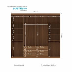 O seu quarto de casal ficará muito mais bonito e prático com esse modelo de roupeiro incrível! Possui Cabideiros: Sim Tipo de Corrediça: Metálica Telescópica Material do Puxador da Gaveta: ABS Possui Organizador de Gaveta: Não Material do Puxador da Porta: ABS Ambiente Principal: Quarto codigo_ean: 7908308740488 Complexidade da Montagem: Alta: deve ser montado por um montador especializado Cor: Jatoba Gaveta com Chave: Não Itens Inclusos: 1 Guarda Roupa, Kit Ferragens e Manual de Montagem Linha ou Coleção: Master Manual de Montagem e Instalação: https://product-hub-prd.madeiramadeira.com.br/832256/documents/36af51cb-962c-40cb-82ef-af3ab7d00884544195633365.832256.832258.pdf Material da Gaveta: MDP Material da Porta: MDP Material da Prateleira: MDP Material Principal: MDP modular: Não Montagem Flex: Não Necessita Montagem: Sim Origem do Produto: Nacional Peso: 140,5 kg Peso Máximo por Gaveta: 3 kg Peso Máximo por Prateleira: 3 kg Possui Calceiros: 02 Possui Espaço para Vestidos Longos: Não Possui Espelho: Não Possui Espelho Interno: Não Possui Ganchos: Não Possui iluminação: Não Possui Painel de TV: Não Possui Pés: Não Possui Portas: Sim Possui Prateleiras: Sim Possui Sapateira: Não Produto Montado: Sim Quantidade de Gavetas: 06 Gavetas Quantidade de Prateleiras: 10 Prateleiras Recomendações de Uso, Manutenção e Limpeza: Pano levemente úmido e flanela. Sistema de Montagem: Parafusos, Cavilhas, Corrediças e Buchas Tipo de Corrediça da Gaveta: Metálica Telescópica Tipo de Dobradiça/Corrediça da Porta: Alumínio Tipo de Gaveta: Externa Tipo de Guarda-Roupa: Casal Tipo de Puxador da Gaveta: Externo Tipo de Puxador da Porta: Externo