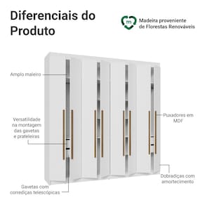 Possui uma pintura de alta resistência, que garante durabilidade e um acabamento impecável por muito mais tempo. A estrutura e as portas são na coloração Branca e os puxadores em tom amadeirado Rustic, criando um visual sofisticado que se adapta a qualquer estilo de decoração. Os puxadores de 80 cm, fabricados em MDF, são um dos grandes diferenciais, trazendo um design alongado e moderno.
