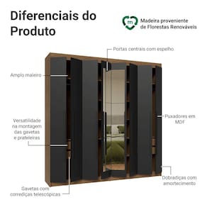 As portas fecham de forma suave e silenciosa, por possuir dobradiças com amortecimento. As gavetas permitem uma abertura completa e o amplo maleiro é perfeito para armazenar itens maiores. O interior do guarda-roupa pode ser personalizado, com a possibilidade de ajustar as gavetas e prateleiras conforme suas necessidades. Além disso, as portas do meio possuem espelho, agregando ainda mais funcionalidade.