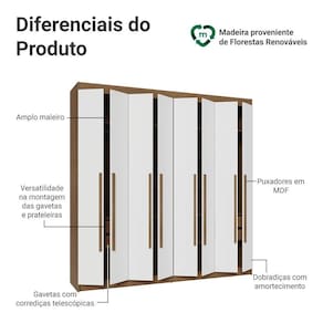 Possui uma pintura de alta resistência, que garante durabilidade e um acabamento impecável por muito mais tempo. A estrutura e os puxadores são em tom amadeirado Rustic e as portas na cor branca. Os puxadores de 80 cm, fabricados em MDF, são um dos grandes diferenciais, trazendo um design alongado e moderno.