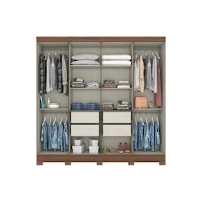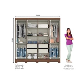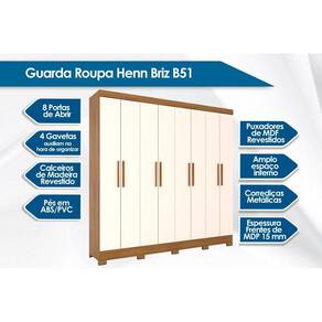 Material dos Cabideiros - Cabideiro de Madeira Tipo de Dobradiças - Dobradiças Metálicas Quantidade de Portas - 8 Portas de Abrir Tipo de Corrediça - c/ Corrediças Metálicas Quantidade de Gavetas - 4 Gavetas Tipo dos Pés - ABS/PVC - Pés Opcionais Quantidade de Prateleiras - 6