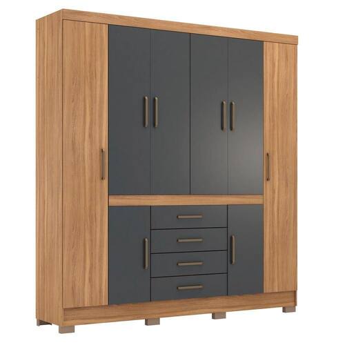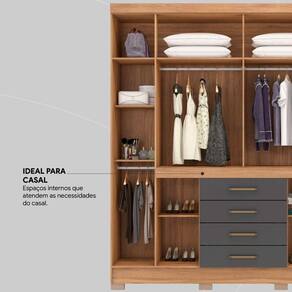 Quer redecorar o quarto do casal e ter mais capacidade de armazenamento? Então vai amar conhecer o Guarda-Roupa New Realce. O design com portas de diferentes dimensões e gavetas externas, além de criar um ponto de destaque no ambiente facilitam o acesso aos compartimentos internos. Legal, não é mesmo? Além do visual, o Guarda-Roupa New Realce tem incrível interna para armazenar os pertences do casal. Nas portas centrais você tem espaços para organizar os cobertores, travesseiros, lençóis e fronhas e também, cabideiros para armazenar diferentes tipos de roupas, como as de comnto médio e as mais volumosas. E tem mais! Portas laterais com prateleiras que são ideais para roupas que podem ficar dobradas, maquiagens, acessórios, bolsas ou o que for ideal para facilitar o dia a dia do casal. Já para as roupas íntimas do casal, o Guarda-Roupa New Realce tem espaçosas gavetas externas. E será que tem espaços para sapatos? Tem, sim! São duas portas com menores dimensões para armazenar os pares de sapatos mais s. Para proporcionar maior durabilidade ao móvel, o Guarda-Roupa New Realce é equipado com jogo de pés em PVC que protegem seu móvel da umidade e também, facilitam na hora de limpar o ambiente. O quarto do casal nunca mais será o mesmo com o Guarda-Roupa New Realce.