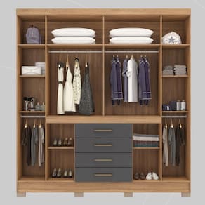 O Guarda Roupa Casal New Realce da Demóbile oferece design moderno e excelente capacidade de armazenamento. Com portas de diferentes dimensões e gavetas externas, ele facilita o acesso aos compartimentos internos. Possui cabideiros para roupas longas e volumosas, prateleiras para itens dobrados e acessórios, gavetas para roupas íntimas e compartimentos para sapatos. O Guarda Roupa New Realce torna seu quarto mais organizado e prático.