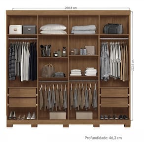 Os 2 cabideiros em alumínio e os 2 calceiros são resistentes, deixam esse guarda-roupa com gavetas mais organizado e facilitam a arrumação das suas roupas, sapatos e objetos pessoais. Além disso esse guarda-roupa moderno possui 6 prateleiras firmes e capazes de sustentar seus utensílios de forma organizada, segura e prática. Esse guarda-roupa 8 portas possui um amplo maleiro capaz de fazer o papel de baú para armazenar jaquetas, roupas de festa, cama e banho ou objetos em geral. A estrutura desse guarda-roupa é em madeira MDP de alta qualidade, durável e capaz de proporcionar mais estilo ao seu dormitório.