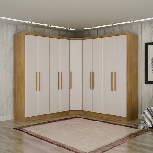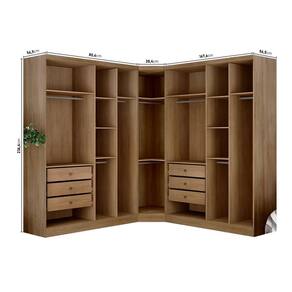 Guarda roupa casal modulado 100% mdf, puxadores com acabamento amadeirado, dobradiças de pressão 35cm, 6 gavetas internas com puxadores e corrediças telescópicas, espaço para longo, cabideiros e calceiros em alumínio.