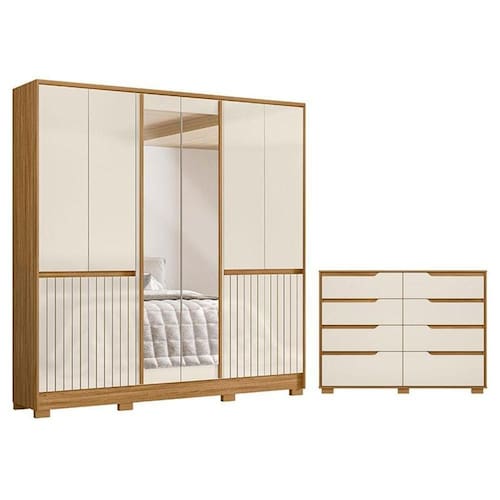 Está montando seu quarto? Apresentamos para você este belo conjunto composto pelo guarda roupa da linha Alasca e a cômoda da linha Georgia. O guarda roupa conta com design sofisticado e um amplo espaço interno com suas dez portas, sendo as duas centrais com espelho e as quatro inferiores com detalhes frisados e puxadores em MDF. Internamente oferece quatro gavetas. Complementando o conjunto, a cômoda possui oito gavetas espaçosas. Os puxadores usinados oferecem um visual clean e moderno. Assim como o guarda roupa, conta com corrediças telescópicas e pés em PVC, garantindo maior resistência e facilidade na hora da limpeza. Fabricados pela Moval, são desenvolvidos em 100% MDP de qualidade, sendo perfeito para quem deseja compor seu quarto com elegância e praticidade. Aproveite e garanta já o seu!