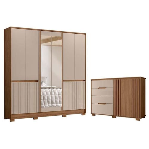 Começou a montar seu quarto? Então apresentamos para você este belo conjunto composto pelo guarda roupa da linha Alasca e a cômoda da linha Texas. O guarda roupa oferece um amplo espaço interno com suas dez portas, sendo as duas centrais com espelho e as quatro portas inferiores com detalhes frisados. Os puxadores em MDF entregam um toque de elegância. Internamente conta com quatro gavetas. Complementando o conjunto, a cômoda apresenta um design moderno com detalhes frisados nas duas portas e possui quatro gavetas. Assim como o guarda roupa, conta com corrediças telescópicas e pés em PVC, garantindo mais estabilidade e praticidade. Fabricados pela Moval, são desenvolvidos em 100% MDP de qualidade, oferecendo mais durabilidade, ótimo aproveitamento de espaço e um design que combina com qualquer ambiente de quarto. Aproveite e garanta já o seu!