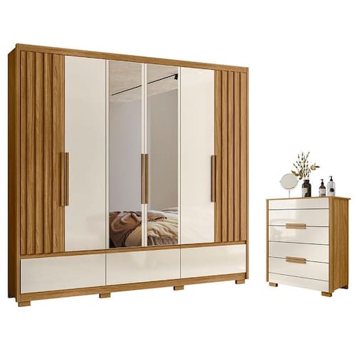 Começou a montar seu quarto? Apresentamos para você este belo conjunto composto pelo guarda roupa da linha Amazonas e a cômoda da linha Dhara. O guarda roupa possui seis portas, sendo as duas portas centrais com espelho e as laterais com detalhes ripados em MDF. Oferecendo três opções na hora da montagem das portas, adequando ao seu gosto, enquanto suas cinco gavetas, sendo duas internas. Acompanhando o conjunto, a cômoda conta com quatro gavetas oferecendo um espaço extra para acomodar suas roupas. Tanto o guarda roupa, quanto a cômoda possuem puxadores em MDF, corrediças telescópicas e pés em PVC complementando o design. Fabricados pela Moval, são desenvolvidos em MDP, sendo perfeito para quem busca estilo, qualidade e praticidade para compor o quarto do casal, aproveitem!