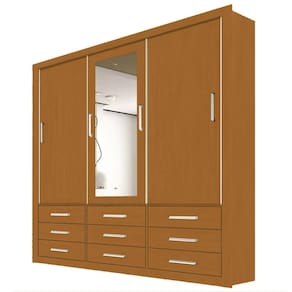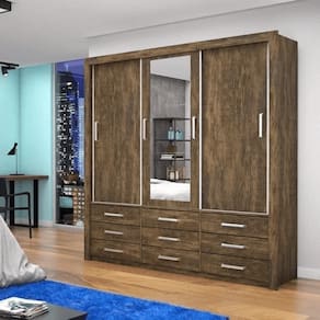 Guarda Roupa Casal Anjos 3 Portas 9 Gavetas com Espelho O seu quarto merece um guarda roupa resistente e com um design incrível. O Guarda Roupa Casal Anjos 3 Portas 9 Gavetas com Espelho é fabricado com materiais de super qualidade e vem com espelho externo para facilitar ao provar suas peças de roupa. Ele possui 9 gavetas e 3 portas de correr, que facilitam na hora de armazenar e manter todas as roupas bem organizadas. Aproveite!\nMedidas\nAltura 208 cm\nLargura 191 cm\nProfundidade 54 cm\nCaracterísticas\nModelo Guarda Roupa Casal Anjos\nTipo do produto Guarda Roupa\nAmbiente Quarto\nMaterial MDF / MDP\nTamanho Casal\nPossui Porta 03\nPossui Gaveta 09\nPossui Pés Não\nPossui Puxador 13\nPossui Cabideiro 02\nPossui Prateleira 02\nTipo de Pintura UltraVioleta\nTipo de Corrediça Metálica\nTipo de Nicho Interno\nTipo de Puxador PVC\nTipo de Prateleira Prateleira Interna\nEscala de Brilho Fosco\nFormato do Espelho Retangular\nGarantia 3 meses\nInformações Importantes\nObjetos decorativos que porventura apareçam na foto, não acompanham o produto. Não nos responsabilizamos pela montagem/instalação dos produtos.\nMontagens, desmontagens e instalações são responsabilidades do cliente. Indicamos que contrate uma empresa de montagem ou um montador de sua confiança.\nAlém disso, favor verificar se os pés e acessórios estão dentro do forro inferior do produto. Em suma, todas as informações divulgadas sobre o produto são de responsabilidade do Fabricante.\nAs cores do produto podem variar de acordo com o seu monitor, a iluminação do ambiente em que você está e até mesmo a sua percepção visual. Além da cor, pequenos detalhes e acabamentos podem não ficar evidentes na foto, por isso as imagens são meramente ilustrativas.