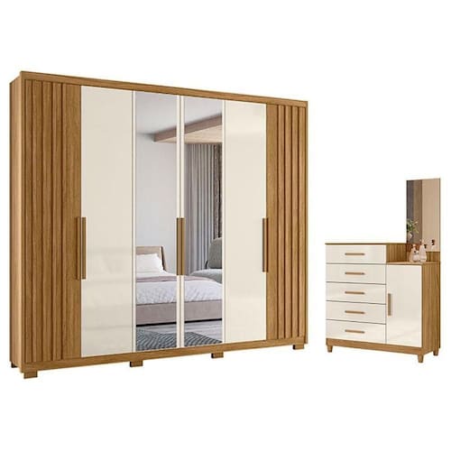Está montando o seu quarto? Apresentamos para você este belo conjunto composto pelo guarda roupa da linha Araguaia e a cômoda da linha Lisboa. O guarda roupa conta com seis portas, sendo duas com detalhes ripados em MDF. Com três opções na hora da montagem das portas, permite se adaptar ao seu gosto. Contando com quatro gavetas internas equipadas com corrediças telescópicas. Complementando o conjunto, a cômoda é possui uma porta e cinco gavetas com corrediças metálicas. Além do painel com espelho dando um charme. Tanto o guarda roupa quanto a cômoda, possuem puxadores em MDF e pés em PVC, garantindo mais estabilidade e boa durabilidade. Fabricados pela Moval, são desenvolvidos em MDP. Com esse conjunto, seu quarto ganha organização, estilo, praticidade e qualidade, aproveitem!
