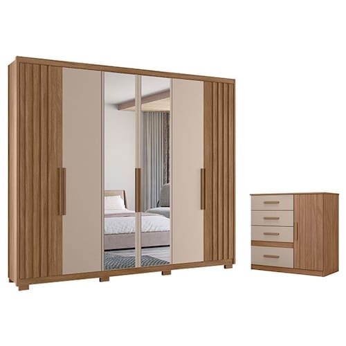 Começou a procurar móveis para seu quarto? Então apresentamos para você este belo conjunto composto pelo guarda roupa da linha Araguaia e a cômoda da linha Vênus. O guarda roupa se destaca por suas seis portas, sendo duas com detalhes ripados em MDF. Com três opções na hora da montagem das portas, se adapta de acordo com o seu gosto. Internamente, conta com quatro gavetas com corrediças telescópicas e pés em PVC entregando mais estabilidade e durabilidade. Combinando com o guarda roupa, a cômoda possui uma porta com detalhes frisados e quatro gavetas com corrediças metálicas. Assim como o guarda roupa, a cômoda conta com puxadores em MDF. Fabricado pela Moval, são desenvolvidos em MDP. Sendo perfeito para quem busca qualidade, beleza e organização, aproveitem!