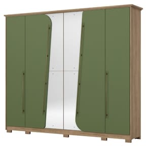 Guarda Roupa Casal Atalaia 6 Portas Com Espelho Henn Jequetiba/verde Ja imaginou um movel moderno e perfeito para deixar tudo organizado em seu quarto. Com o guarda roupa Dubai da Henn voce nao tera mais preocupacoes com a bagunca. O guarda roupa Dubai tem 6 portas de bater com puxadores em aluminio . Com amplo espaco interno, conta com 6 gavetas internas para organizar suas roupas. Nao perca mais essa novidade e garanta ja o seu. Puxadores em aluminio, com haste arredondada e em tamanhos diferentes Portas usinadas com formato arredondado Corredicas Telescopicas Dobradicas de 35 mm com amortecimento Gavetas com usinagem para pega Cabideiros em aluminio Moldura lateral de 15 mm Chapeu de 25 mm Pintura UV MDP Fundo: MDF