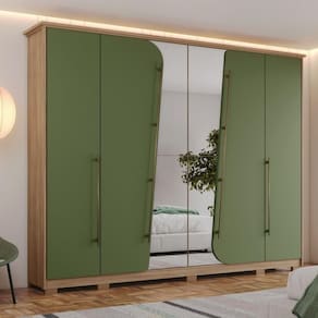 Guarda Roupa Casal Atalaia 6 Portas Com Espelho Henn Jequetiba/verde Ja imaginou um movel moderno e perfeito para deixar tudo organizado em seu quarto. Com o guarda roupa Dubai da Henn voce nao tera mais preocupacoes com a bagunca. O guarda roupa Dubai tem 6 portas de bater com puxadores em aluminio . Com amplo espaco interno, conta com 6 gavetas internas para organizar suas roupas. Nao perca mais essa novidade e garanta ja o seu. Puxadores em aluminio, com haste arredondada e em tamanhos diferentes Portas usinadas com formato arredondado Corredicas Telescopicas Dobradicas de 35 mm com amortecimento Gavetas com usinagem para pega Cabideiros em aluminio Moldura lateral de 15 mm Chapeu de 25 mm Pintura UV MDP Fundo: MDF