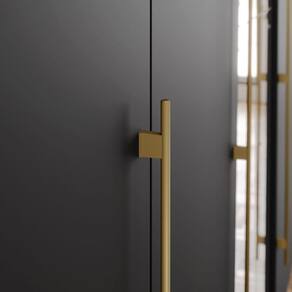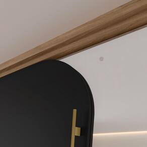 Puxadores em alumínio, com haste arredondada e em tamanhos diferentes Portas usinadas com formato arredondado Corrediças Telescópicas Dobradiças de 35 mm com amortecimento Gavetas com usinagem para pega Cabideiros em alumínio Moldura lateral de 15 mm Chapéu de 25 mm Pintura UV MDP Fundo: MDF